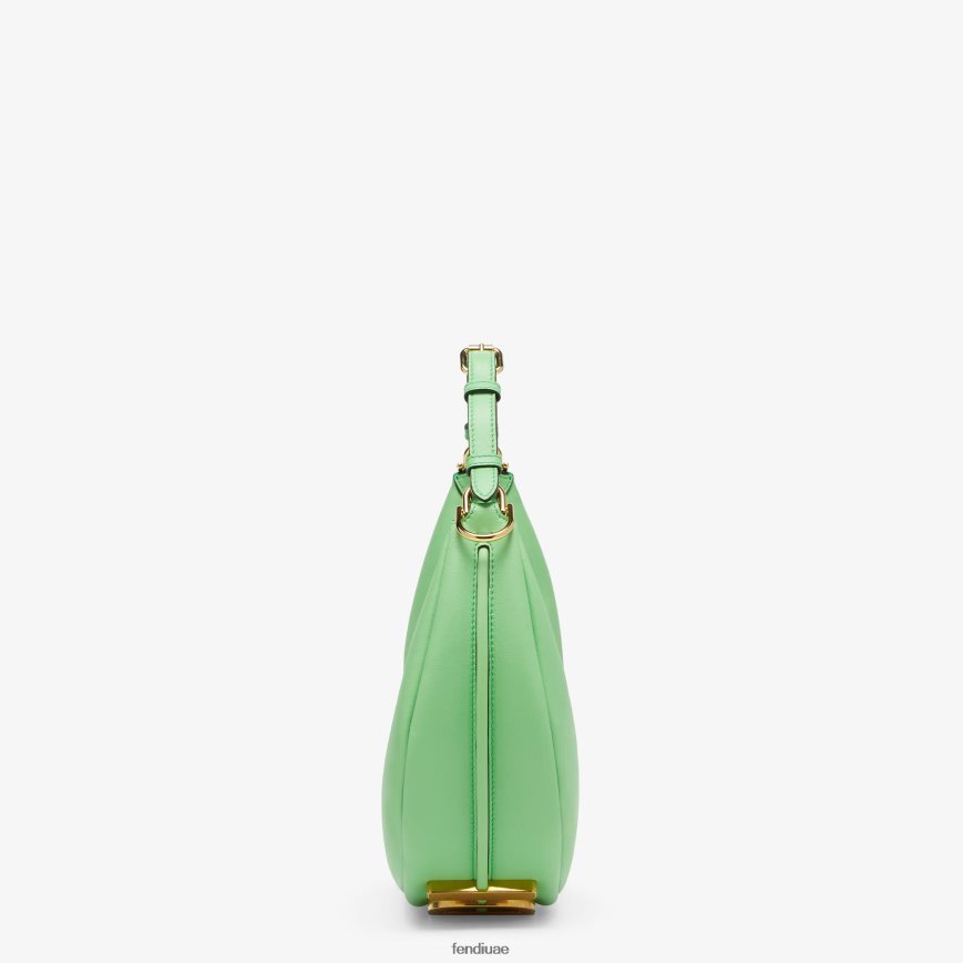 حقيبة هوبو صغيرة مصنوعة من الجلد الأخضر المرن، ومزينة بحروف فندي معدنية ذهبية عتيقة يمكن رؤيتها عند ارتداء الحقيبة تحت الذراع.
