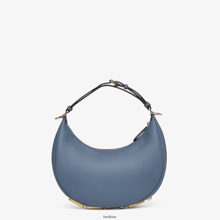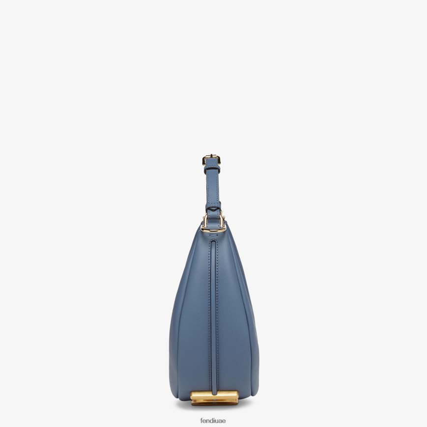 حقيبة هوبو صغيرة مصنوعة من الجلد الناعم باللون الأزرق، ومزينة بحروف فندي معدنية ذهبية عتيقة يمكن رؤيتها عند ارتداء الحقيبة تحت الذراع.