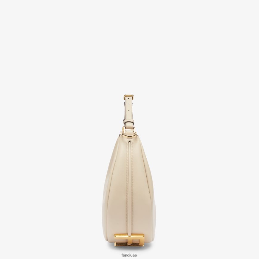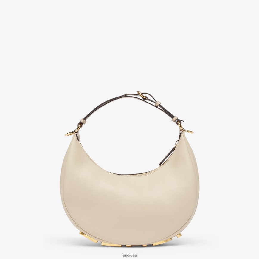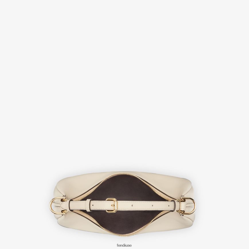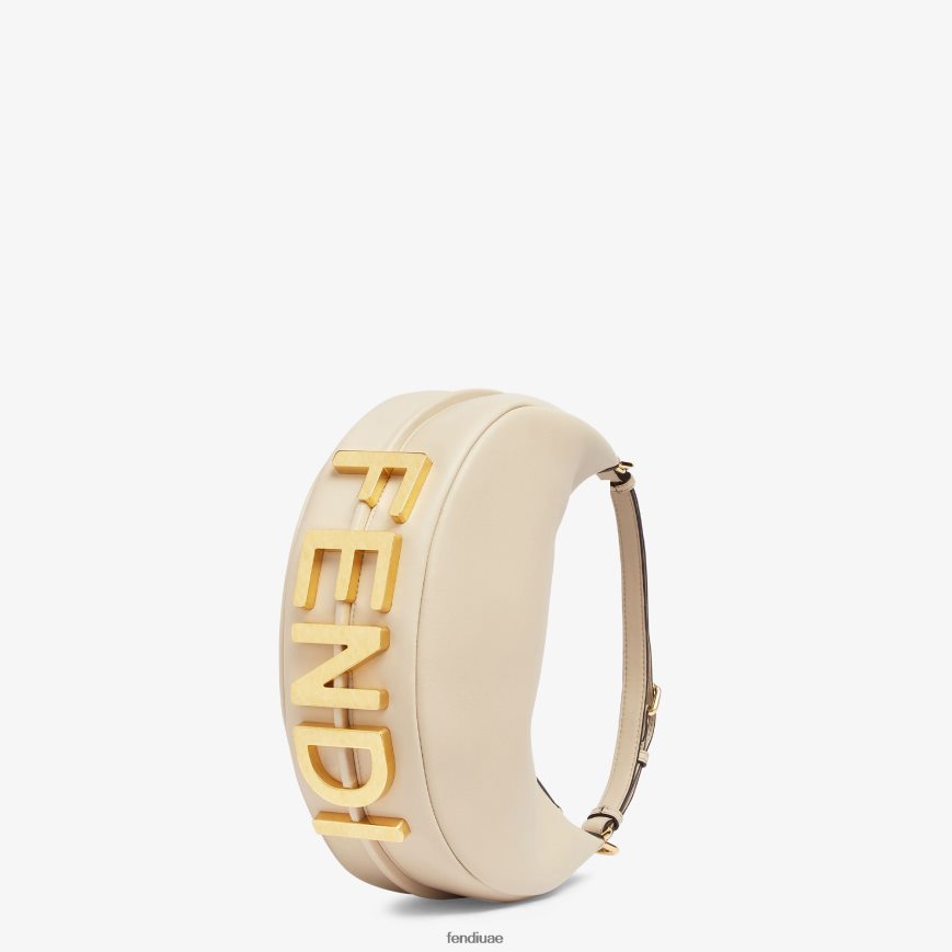 حقيبة هوبو صغيرة مصنوعة من جلد بيج ناعم، مزينة بحروف فندي معدنية ذهبية عتيقة يمكن رؤيتها عند ارتداء الحقيبة تحت الذراع.