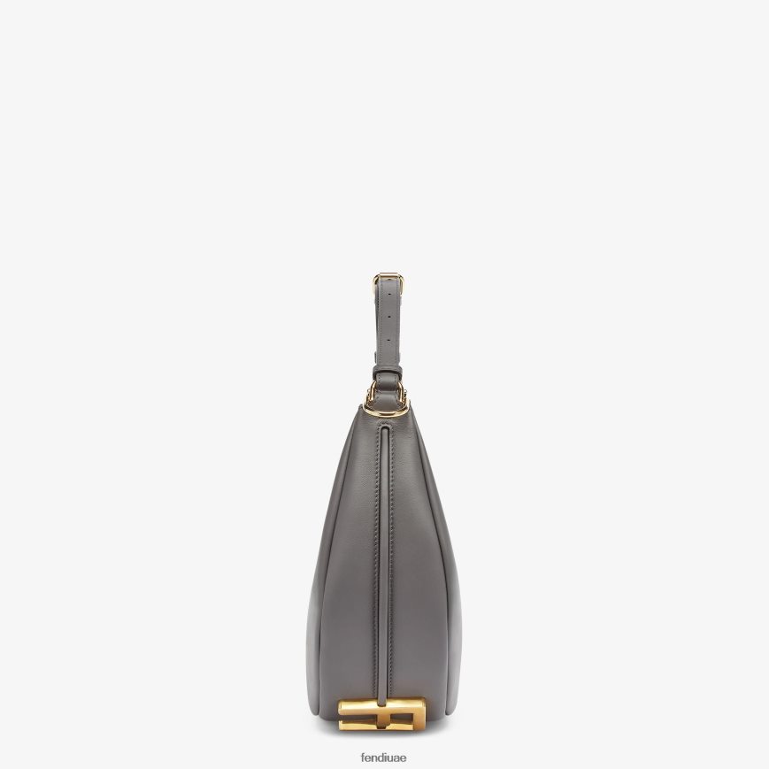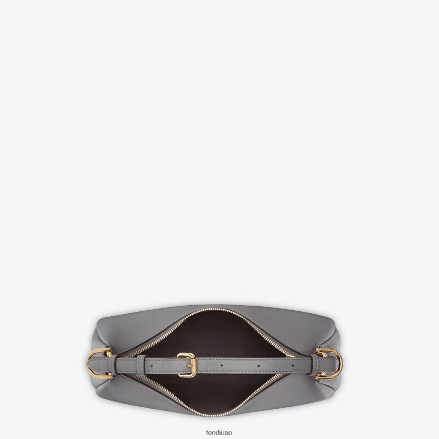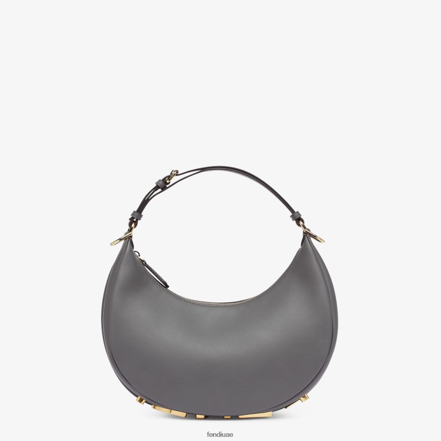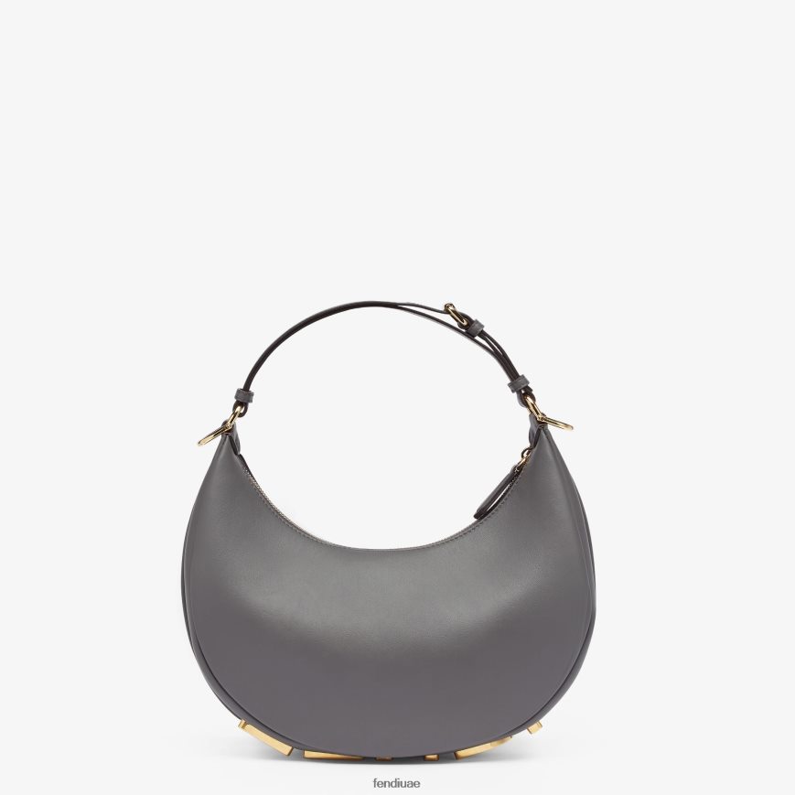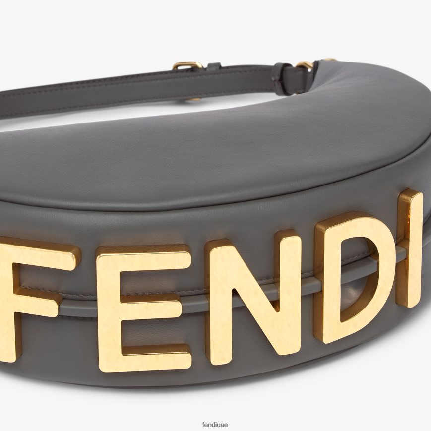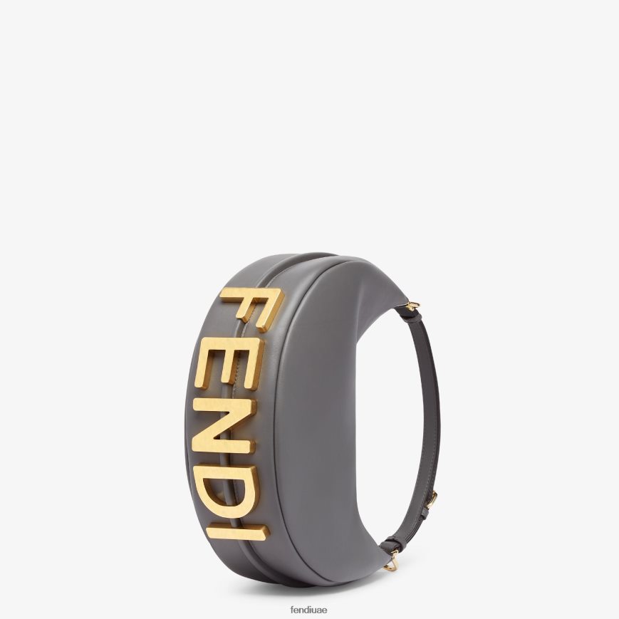 حقيبة هوبو صغيرة مصنوعة من الجلد الناعم باللون الرمادي الداكن، ومزينة بحروف فندي معدنية ذهبية عتيقة يمكن رؤيتها عند ارتداء الحقيبة تحت الذراع.
