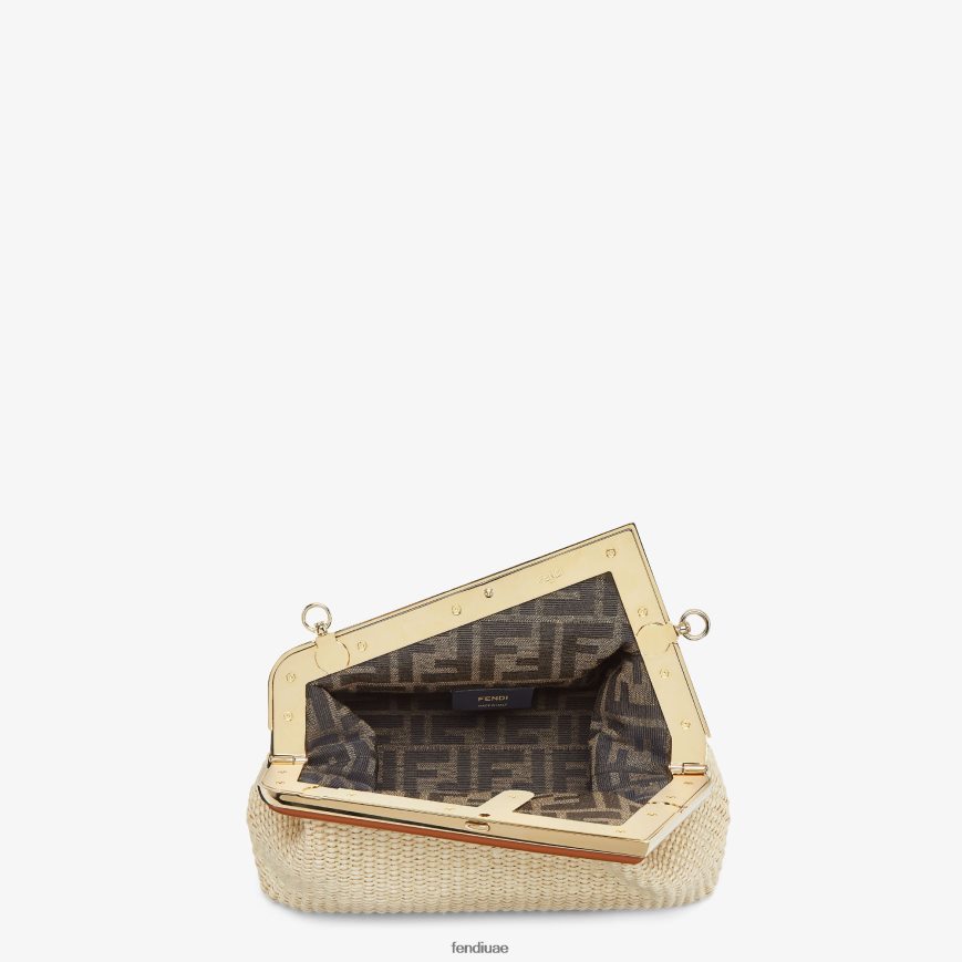 أول حقيبة صغيرة من فندي مصنوعة من القش ذو اللون الطبيعي مع نسيج غرز طحلبي ومشبك معدني كبير الحجم على شكل حرف F مربوط بجلد النابا باللون البني.