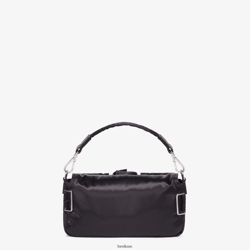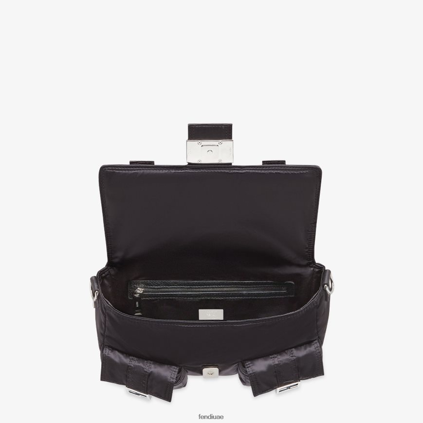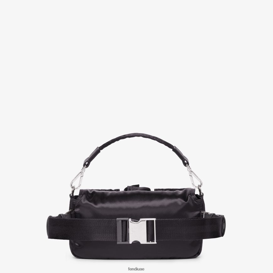 حقيبة باغيت متعددة الجيوب مصنوعة من النايلون الأسود اللامع المُعاد تدويره، مع خمسة جيوب بأحجام مختلفة. تم تزيين الجيوب والغطاء الأمامي بمشبك ff الشهير. مزينة بجلد أسود.