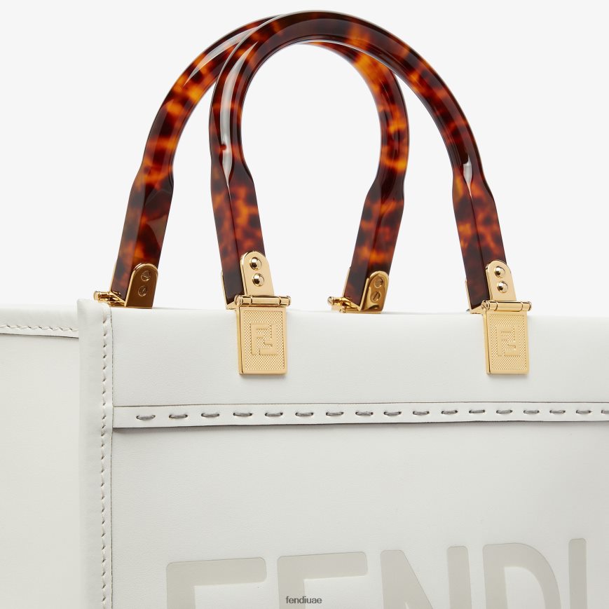 حقيبة تسوق صغيرة من نوع Sunshine مصنوعة من الجلد الأبيض مع حروف فندي روما المختومة ومقابض من زجاج شبكي صلب بنقش صدف السلحفاة.
