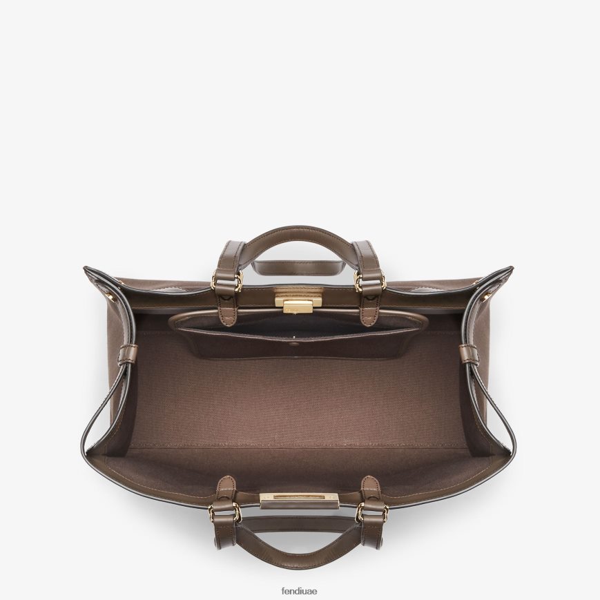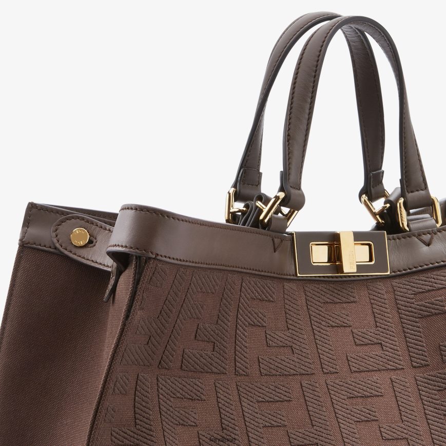 حقيبة متوسطة الحجم مصنوعة من القماش باللون البني الداكن ومزينة بشعار ff المطرز. مزينة بجلد ملون ومزينة بقفل كلاسيكي ملتوي.