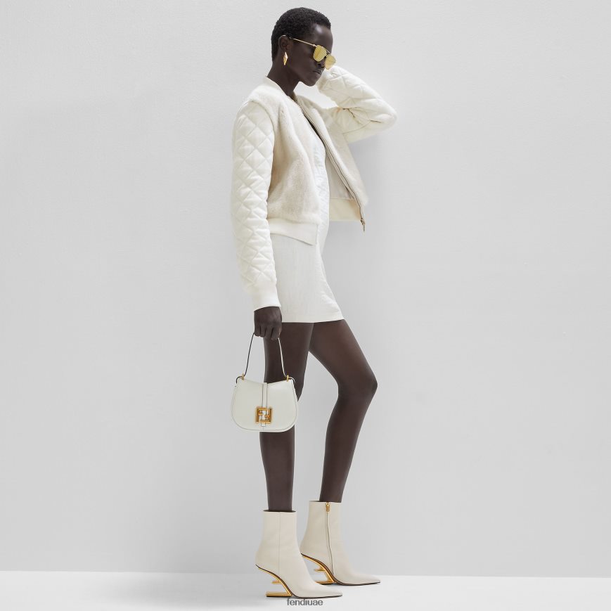 حقيبة صغيرة بخطوط أنثوية منحنية مصنوعة من الجلد الأبيض. مزينة بتفاصيل وحواف منقوشة وشعار ff على الغطاء.