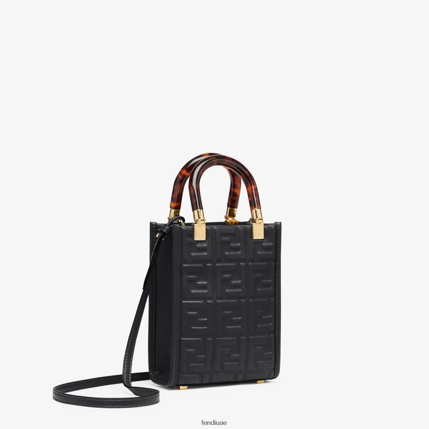 حقيبة تسوق صغيرة "صن شاين" مصنوعة من الجلد باللون الأسود ومزخرفة بنسيج ثلاثي الأبعاد ومقابض زجاجية صلبة بتأثير صدفة السلحفاة.