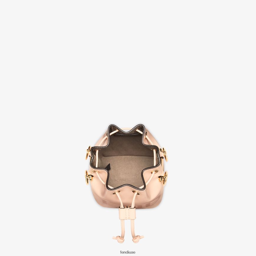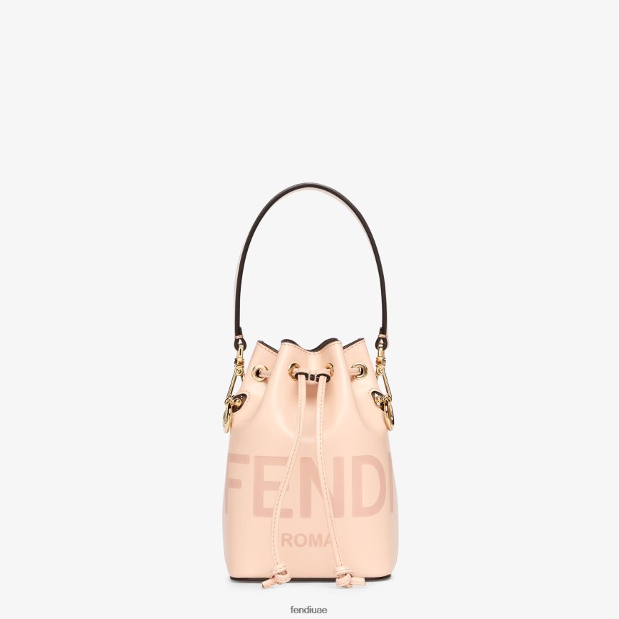حقيبة دلو مون تريزور صغيرة من الجلد باللون الوردي الفاتح، مع طباعة حروف فندي روما.
