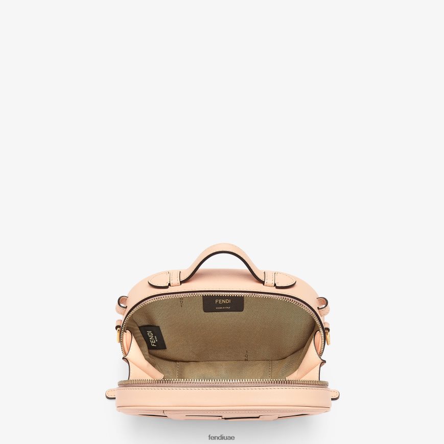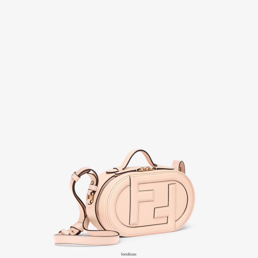 حقيبة صغيرة بيضاوية الشكل مصنوعة من الجلد باللون الوردي الفاتح غير اللامع مع شعار ff. إغلاق بسحاب مع منزلق مزدوج. الجيب الخلفي الخارجي.