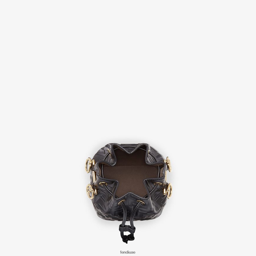 حقيبة باكيت مون تريزور صغيرة مع رباط للإغلاق وزخارف معدنية على شكل شعار فندي. حزامان للكتف قابلان للفصل، أحدهما طويل والآخر قصير، لوضع الحقيبة على الكتف أو على شكل متقاطع. مصنوع من جلد العجل الأسود. نمط ff مميز تم إنشاؤه بطباعة بارزة. أدوات معدنية مطلية بالذهب.