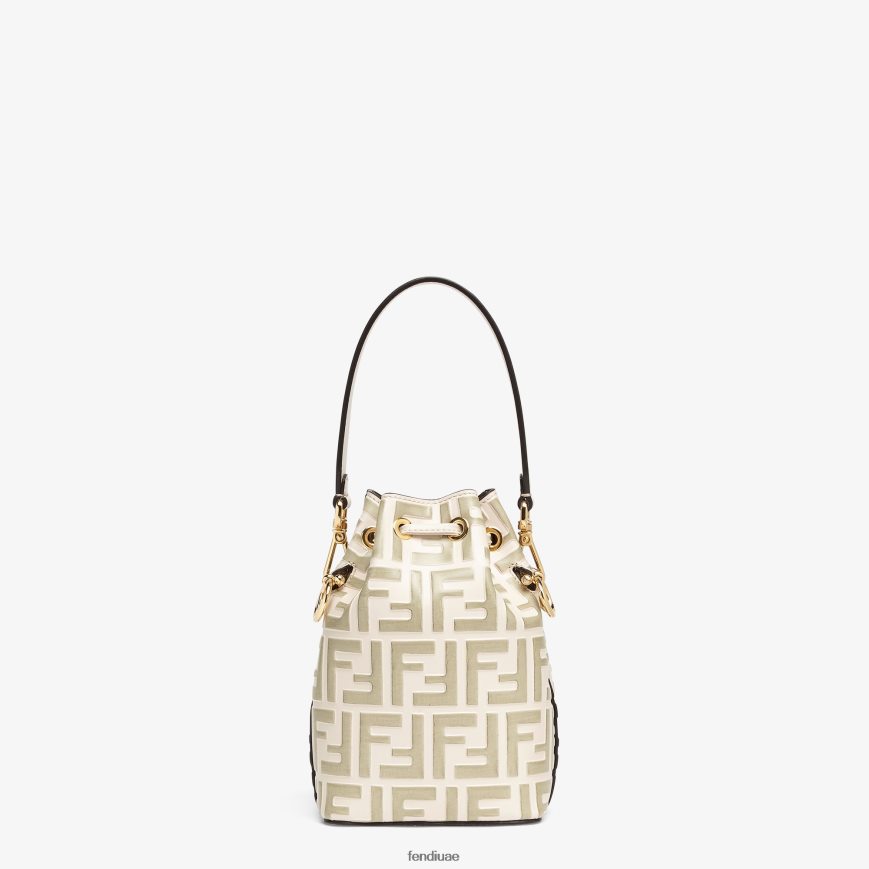 حقيبة باكيت مون تريزور صغيرة مع رباط للإغلاق وزخارف معدنية على شكل شعار فندي. حزامان للكتف قابلان للفصل، أحدهما طويل والآخر قصير، لوضع الحقيبة على الكتف أو على شكل متقاطع. مصنوع من الجلد البيج. تم تشطيبه بطباعة FF منقوشة ومرسومة يدويًا باللون الوردي. أدوات معدنية مطلية بالذهب.