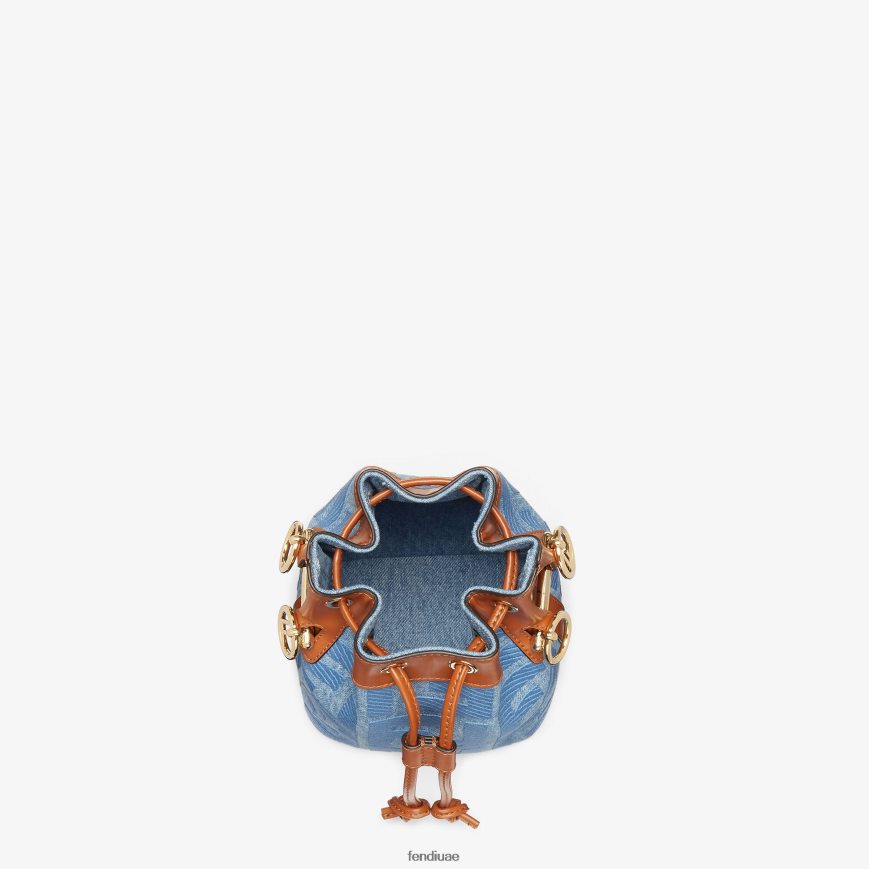 حقيبة دلو مون تريزور صغيرة مصنوعة من قماش الدنيم باللون الأزرق الفاتح مع شعار ff متناغم مع تطريز بارز وحواف من الجلد باللون البني.