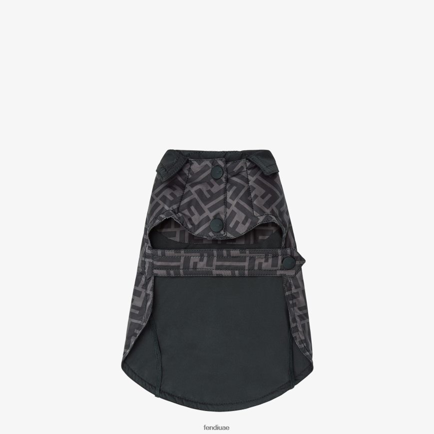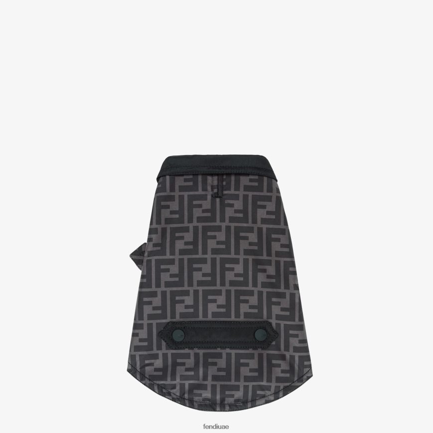 معطف للكلاب مصنوع من النايلون مع شعار ff بظلال من اللونين الأسود والرمادي. تم تشطيبه بياقة وحزام قابل للإزالة على الظهر باللون الأسود، وقماش مبطن قليلاً. أزرار كبس وحزام للإغلاق أسفل البطن.
