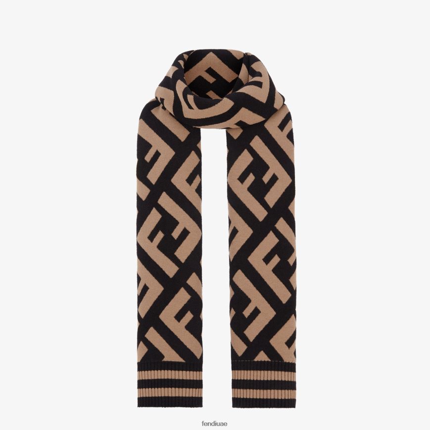 وشاح مصنوع من مزيج رائع من الصوف والفيسكوز مع ملمس ناعم ومضغوط. يُنشئ نسيج الجاكار شكل الماكرو ff الشهير بدرجات اللونين الأسود والبني.