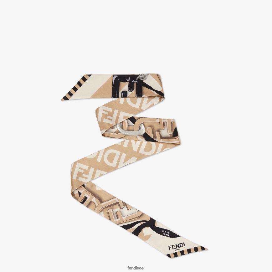 ملفوف على الوجهين. يمكن ارتداؤها حول الرقبة، أو عقدها عند المعصم، أو استخدامها لتزيين حقيبة بلمسة من الألوان. مصنوع من الحرير العضوي، ومزين بزخارف فندي أولوك المطبوعة باللونين العاجي والبيج على جانب واحد. والآخر مزين بشعار مرآة فندي بنفس الألوان.
