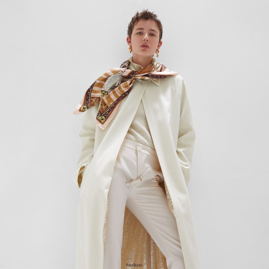 وشاح مربع مصنوع من نسيج قطني طويل من الحرير باللونين البني والبيج. تلتقط طبعة حقائب فندي الشهيرة بعض العناصر الأكثر شهرة للعلامة التجارية. خمس حقائب، من الرغيف الفرنسي والبيكين، محاطة بصندوق مستوحى من الطراز العتيق مزين بنمط شريطي من البيكين. تم تزيين الخلفية بدرجة لونية مع شعار ff الشهير. حواف متباينة مع تفاصيل مخططة وشعار ff. حواف ملفوفة يدويًا.