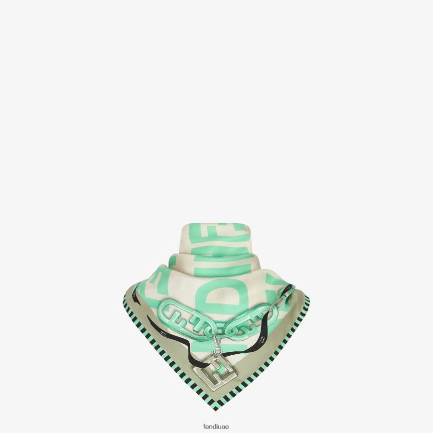 وشاح مصنوع من الحرير العضوي باللونين الأخضر والعاجي. تجمع الرسومات الجذابة بين العناصر المميزة مثل سلسلة فندي أولوك وشريط الشعار الأسود. تم استخدام شكل مرآة فندي كخلفية لإنشاء تأثير ثلاثي الأبعاد. إطار pequin بنفس الألوان.