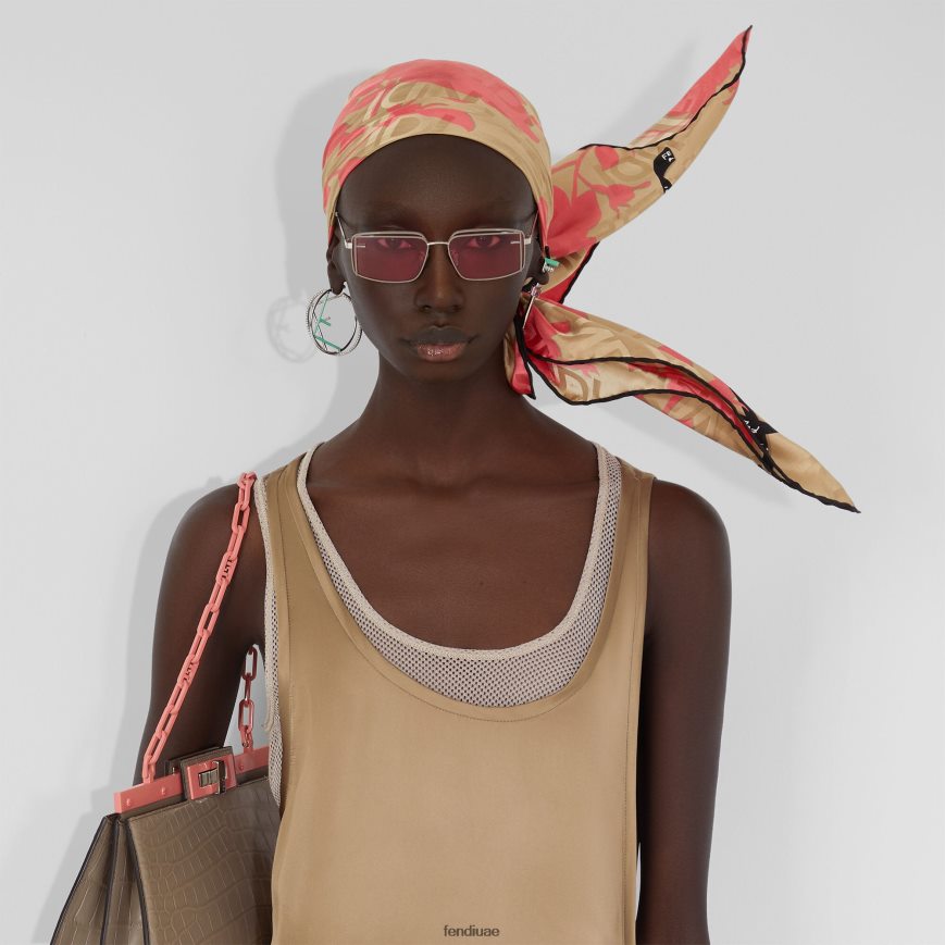 فولارد مصنوع من الحرير العضوي مع زخارف ورود فندي مطبوعة بالكامل باللونين البيج والوردي. الشريط الأسود يؤطر الرسومات. طرف من قماش الجاكار منسوج مع شعار مرآة فندي بدرجة اللون. حواف ملفوفة يدويًا.