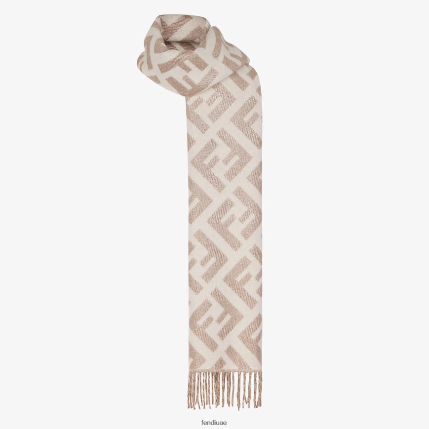 وشاح طويل انتهى مع التهديب. مصنوع من الكشمير الأبيض. نسيج الجاكار بخيوط اللوريكس يخلق شعار ff بلون متباين قليلاً.