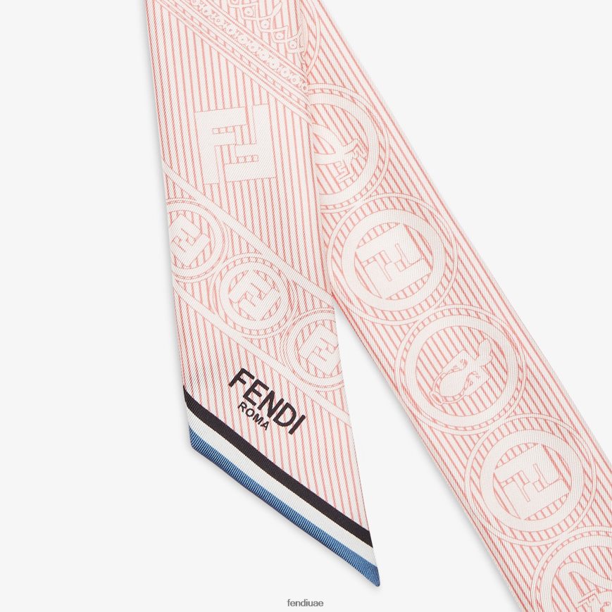 ملفوف على الوجهين. يمكن ارتداؤها حول الرقبة، أو عقدها عند المعصم، أو استخدامها لتزيين حقيبة بلمسة من الألوان. مصنوع من الحرير المخطط باللونين الوردي والأبيض، مع طباعة رسومية لعلم التنجيم من فندي في كل مكان. مزين بشعار فندي روما وخطوط متباينة على الأطراف.