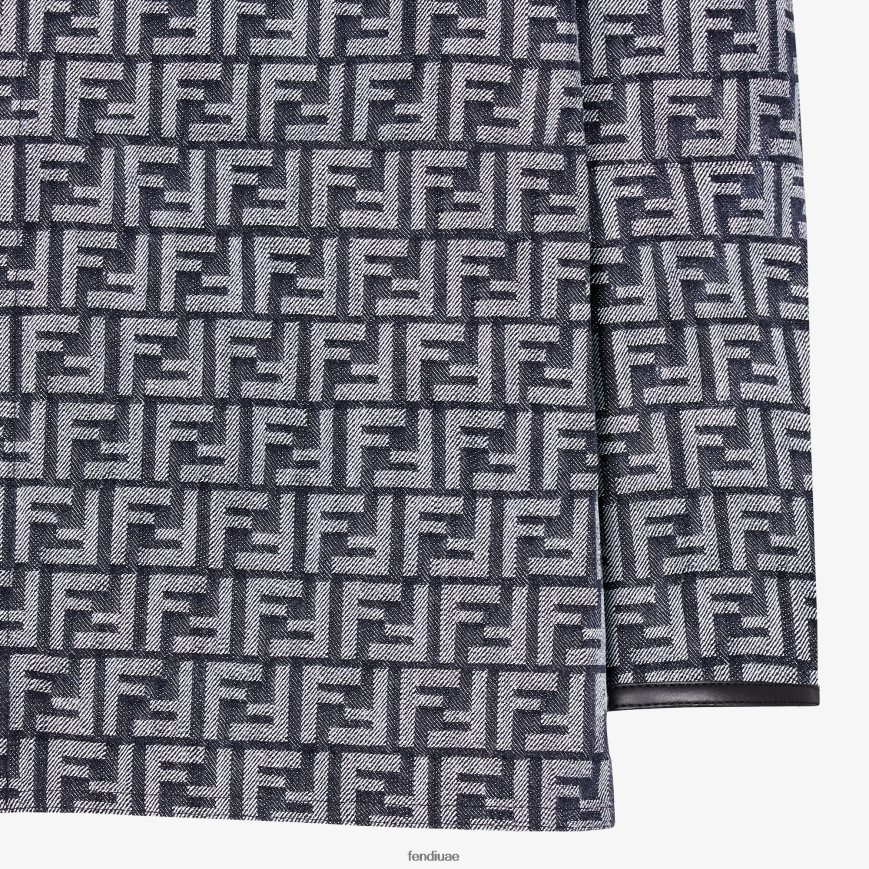 سترة كبيرة الحجم بصدر واحد. جيوب رقعة على الصدر وأكمام طويلة. إغلاق بأزرار كبس مخفية. مصنوع من قماش الدنيم الأزرق مع زخارف جاكار ff على كامل التصميم. مزين بزخرفة جلدية على الياقة والأصفاد. غير مُبطن.
