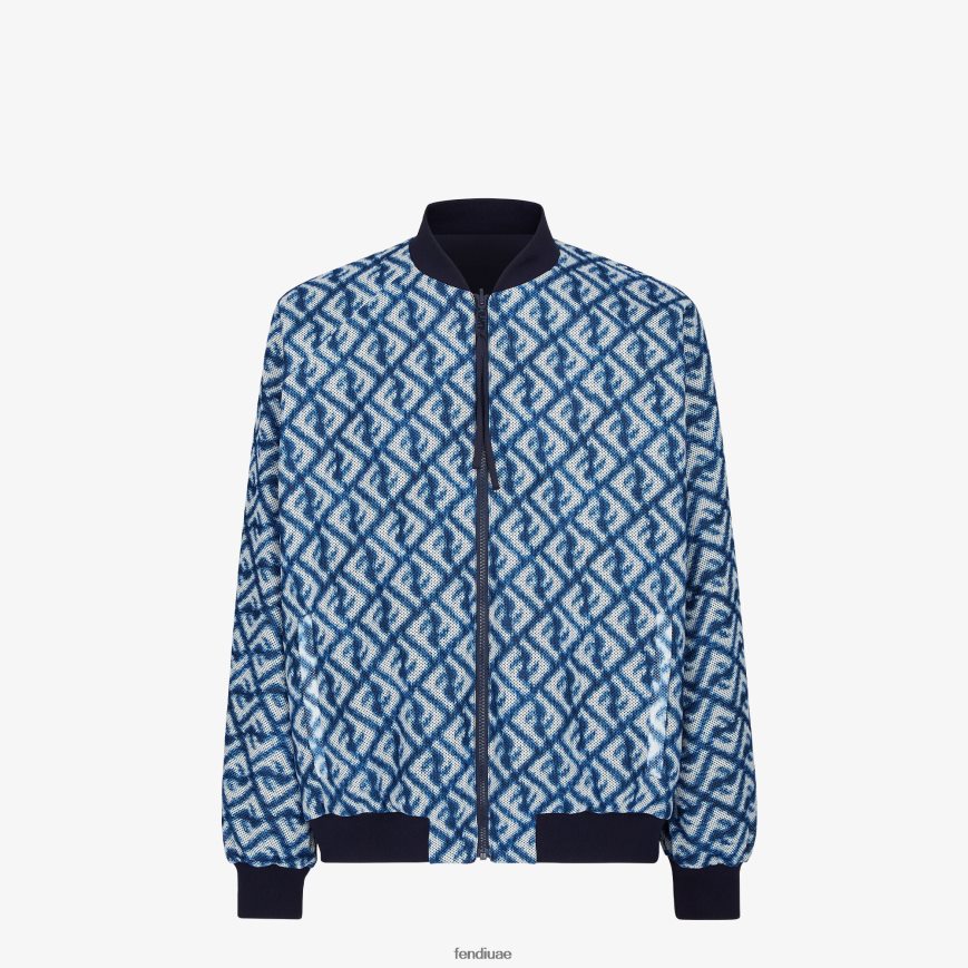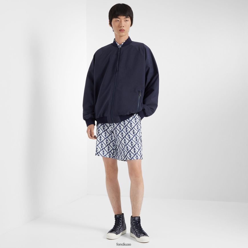 سترة بومبر ذات وجهين مع ياقة مضلعة وأساور أكمام وحاشية. أكمام ريجلان طويلة وجيوب جانبية بسحاب. إغلاق بسحاب مع منزلق مزدوج. مصنوع من النايلون الأزرق. وعندما يكون مبللاً، يكشف القماش عن تصميم ff بلون مطابق. بطانة مع طبعة FF قطرية بتأثير إيكات بالكامل باللونين الأزرق والأبيض.