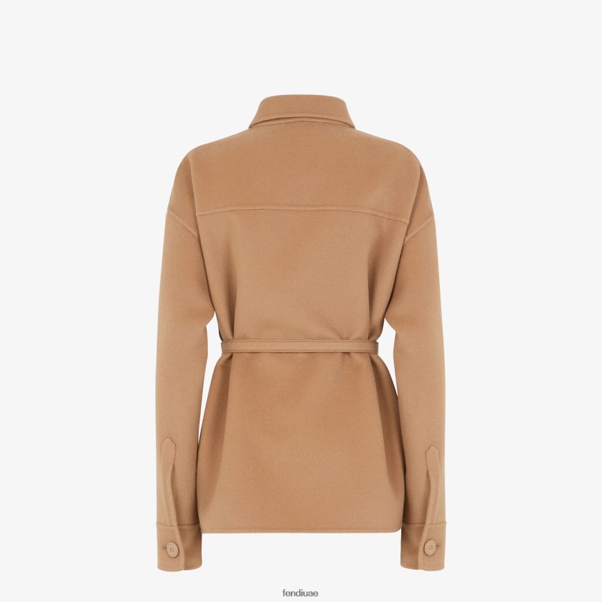 سترة أحادية الصدر مع ياقة قميص وأكمام منخفضة القطع. حزام مطابق بإبزيم معدني من فندي أولوك. جيوب رقعة كبيرة الحجم على الصدر. مصنوع من الكشمير ذو الوجهين بلون الجمل. مزخرف بأحرف فندي وتطريز مطابق للون على جيب الصدر الأيسر كما تم ارتداؤه.