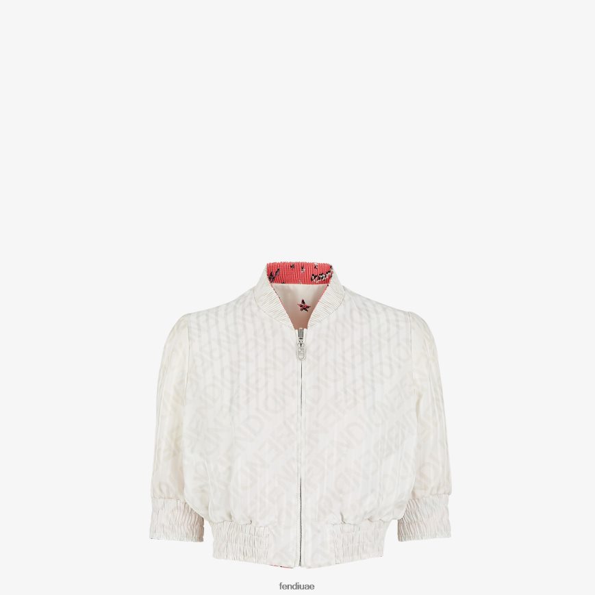 سترة بومبر قصيرة الأكمام وقابلة للعكس. طوق مطاطي، والأصفاد والحاشية. إغلاق بسحاب أمامي. مصنوع من الحرير. أحد الجانبين باللونين الوردي والأبيض مع طباعة شعار تنجيم فندي في كل مكان، والجانب الآخر باللون الأبيض مع تأثير مقلم لامع وحروف فندي مرآة قطرية مطبوعة بلون متباين قليلاً.