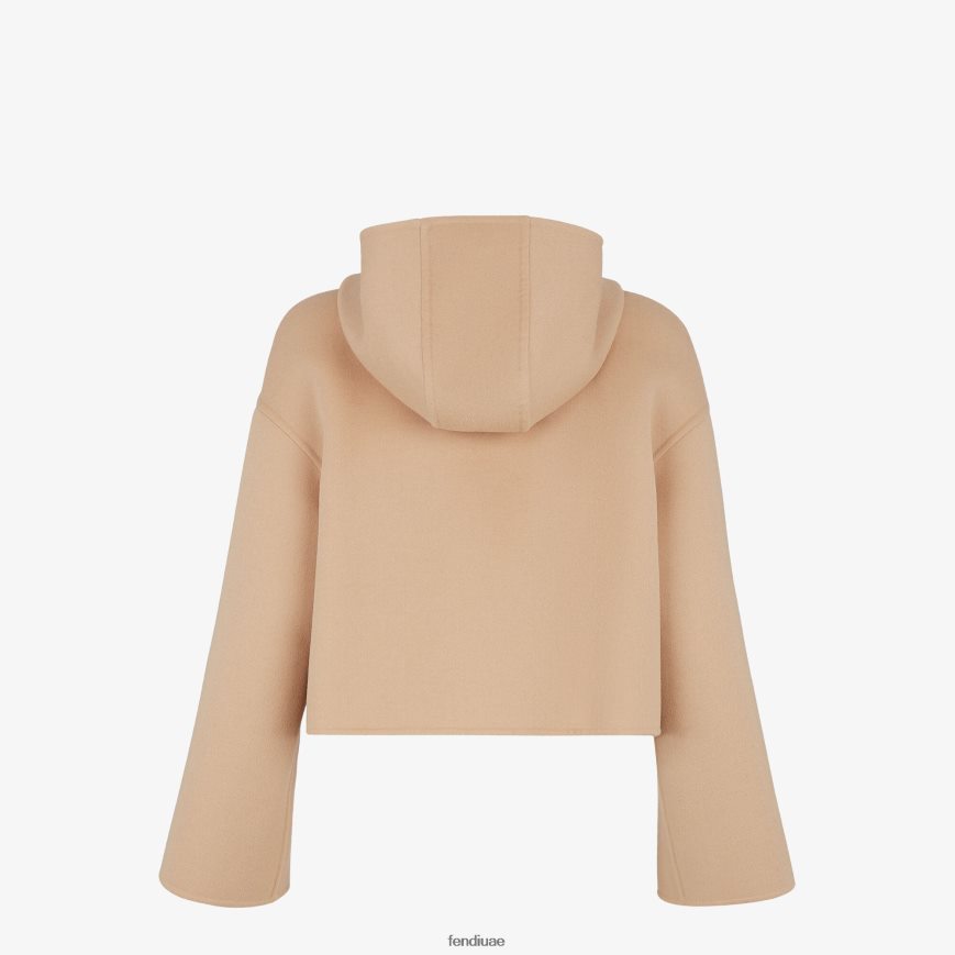 سترة قصيرة ذات غطاء رأس وجيوب رقعة وأكمام واسعة ومنخفضة القطع. إغلاق بسحاب مع منزلق مزدوج. مصنوع من نسيج الصوف باللون البيج على الوجهين. جيوب جلدية متناغمة. بطانة مخصصة بزخارف على كامل التصميم.