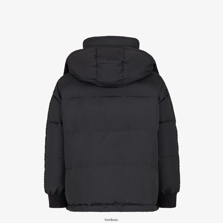 سترة قصيرة أسفل مع ذوي الياقات العالية وغطاء محرك السيارة. إبزيم الرمز البريدي. مصنوع من النايلون الأسود. مزين بشريط ff مطابق على الأكتاف والأكمام. بطانة متباينة من النايلون مع شعار ff بدرجات اللون البني.