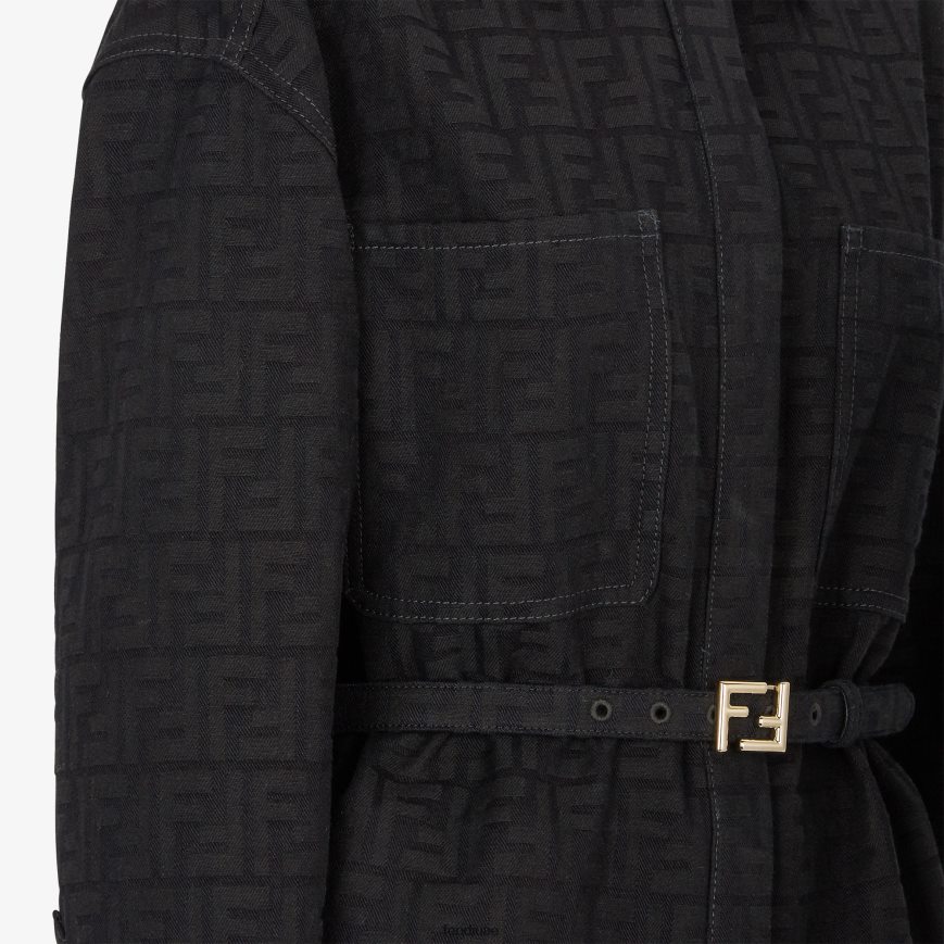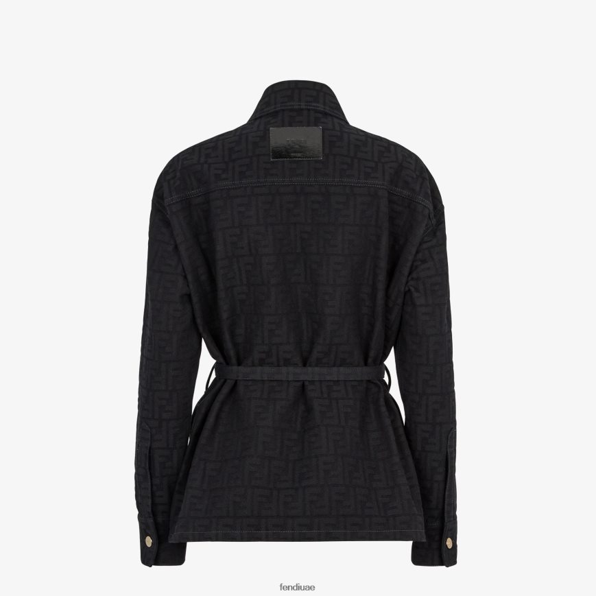 سترة أحادية الصدر مع ياقة قميص وأكمام منخفضة القطع. حزام متناسق مع المعدن ff. جيوب رقعة كبيرة الحجم على الصدر. مصنوع من قماش الدنيم باللون الأزرق الداكن مع زخرفة جاكار ff متطابقة على كامل التصميم. تم تشطيبه بزر أول معدني مرئي مع لمسة نهائية ذهبية.
