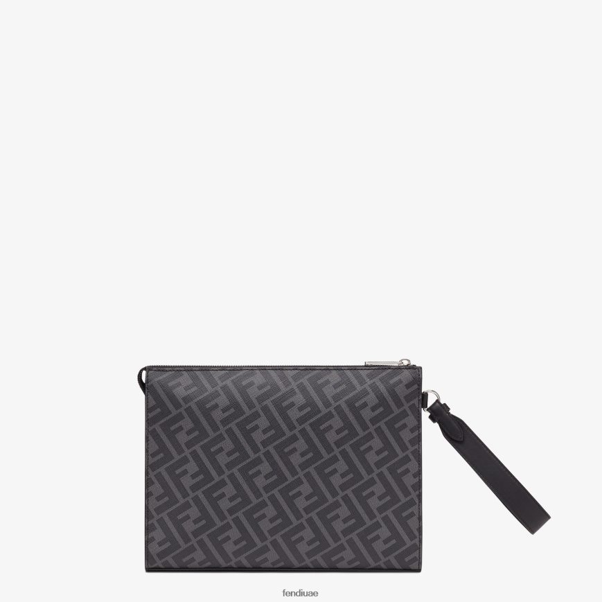 حقيبة بمقبض سوار قابل للإزالة، وحامل بطاقات داخلي وجيب بسحاب قطري في الأمام. اغلاق سحاب البنطلون. مصنوعة من قماش رمادي مزخرف بزخارف ff. مزين ببطانة من الجلد الأسود وتفاصيل مطعمة باللون الأصفر. أدوات معدنية مطلية بالبلاديوم.