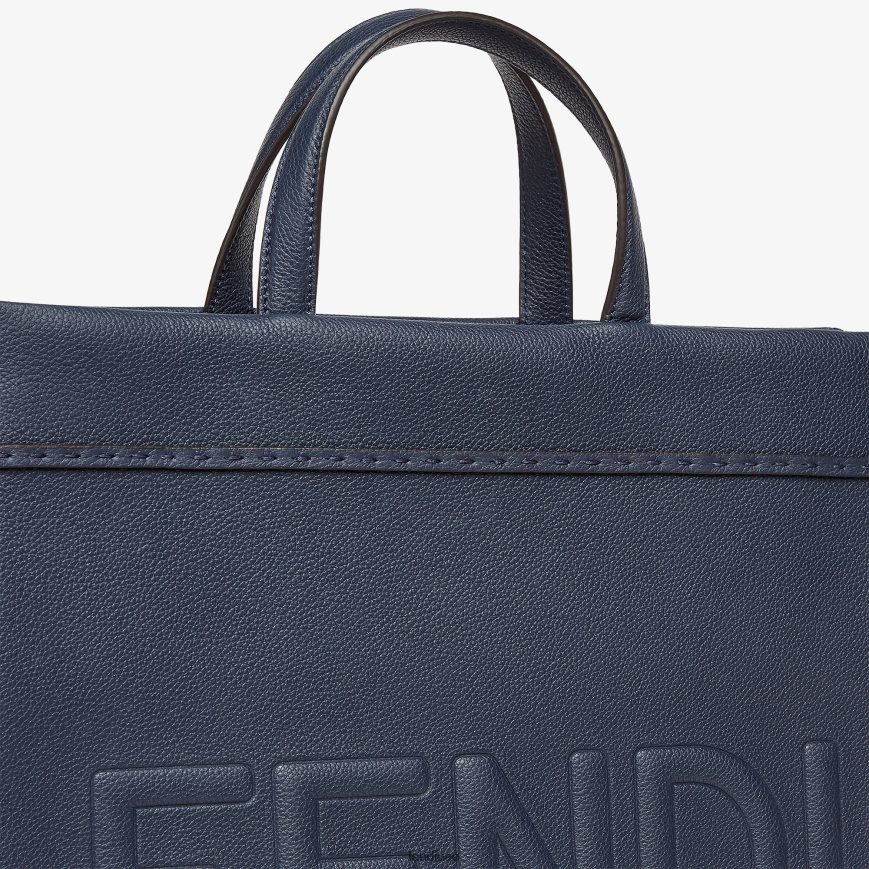 حقيبة تسوق متوسطة الحجم مصنوعة من جلد محبب بالكامل باللون الأزرق الداكن، مع شعار فندي روما ثلاثي الأبعاد. نغمة على درجة اللون وخياطة علوية مخيطة يدويًا وربطة عنق معقودة على الجانب.