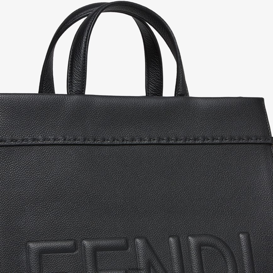 حقيبة تسوق متوسطة الحجم مصنوعة من الجلد الأسود المحبب بالكامل، مع شعار فندي روما ثلاثي الأبعاد. نغمة على درجة اللون وخياطة علوية مخيطة يدويًا وربطة عنق معقودة على الجانب.