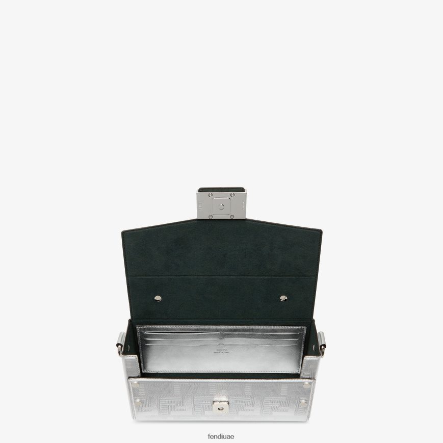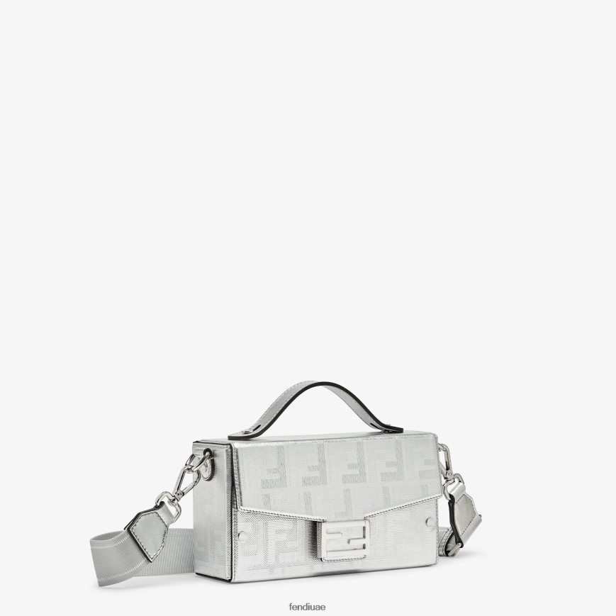 حقيبة باغيت ناعمة مصنوعة من جلد فندي باللون الفضي ومزخرفة بنسيج مخطط. رفرف بمشبك مغناطيسي على شكل حرف ff. مزين بجلد ملون.