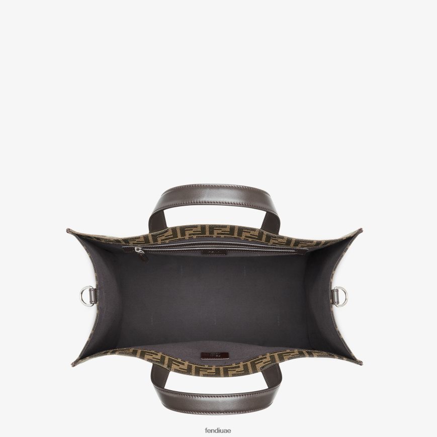 حقيبة تسوق واسعة مصنوعة من قماش جاكار معاد تدويره مع شعار ff باللون البني.