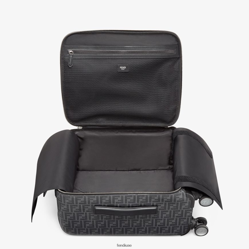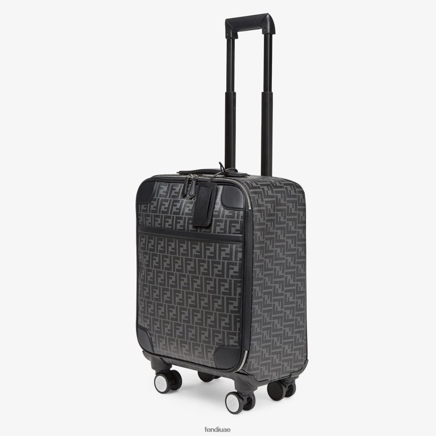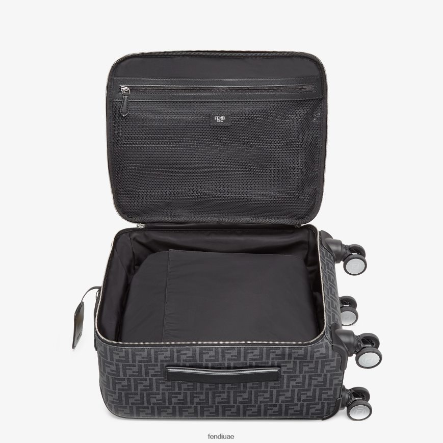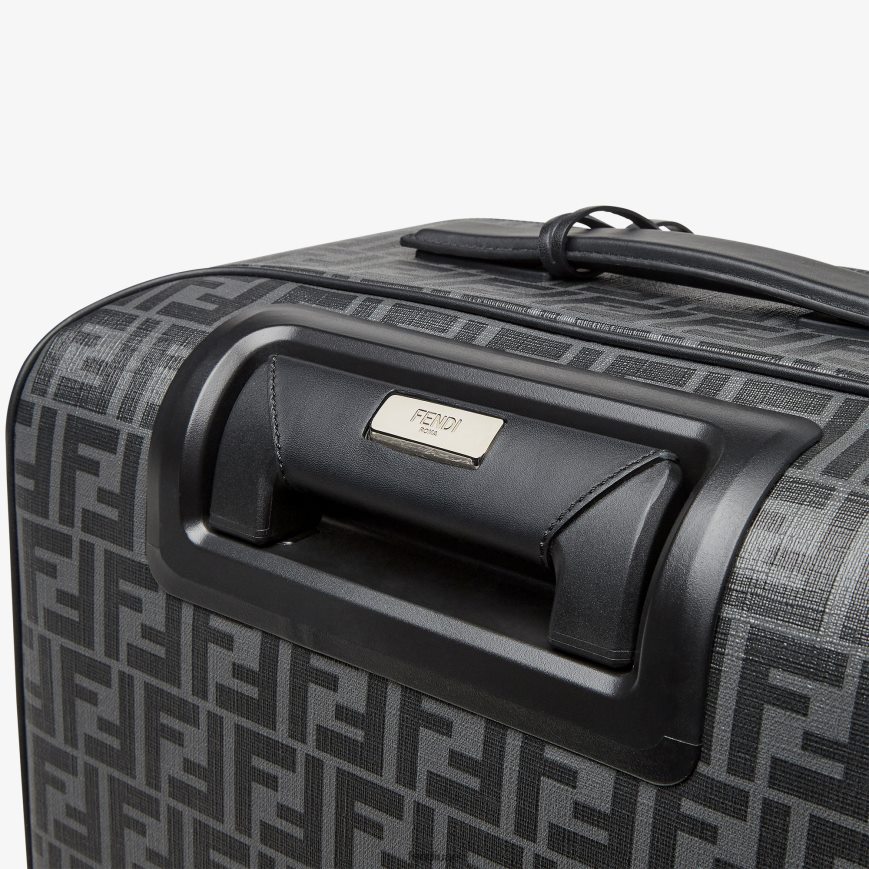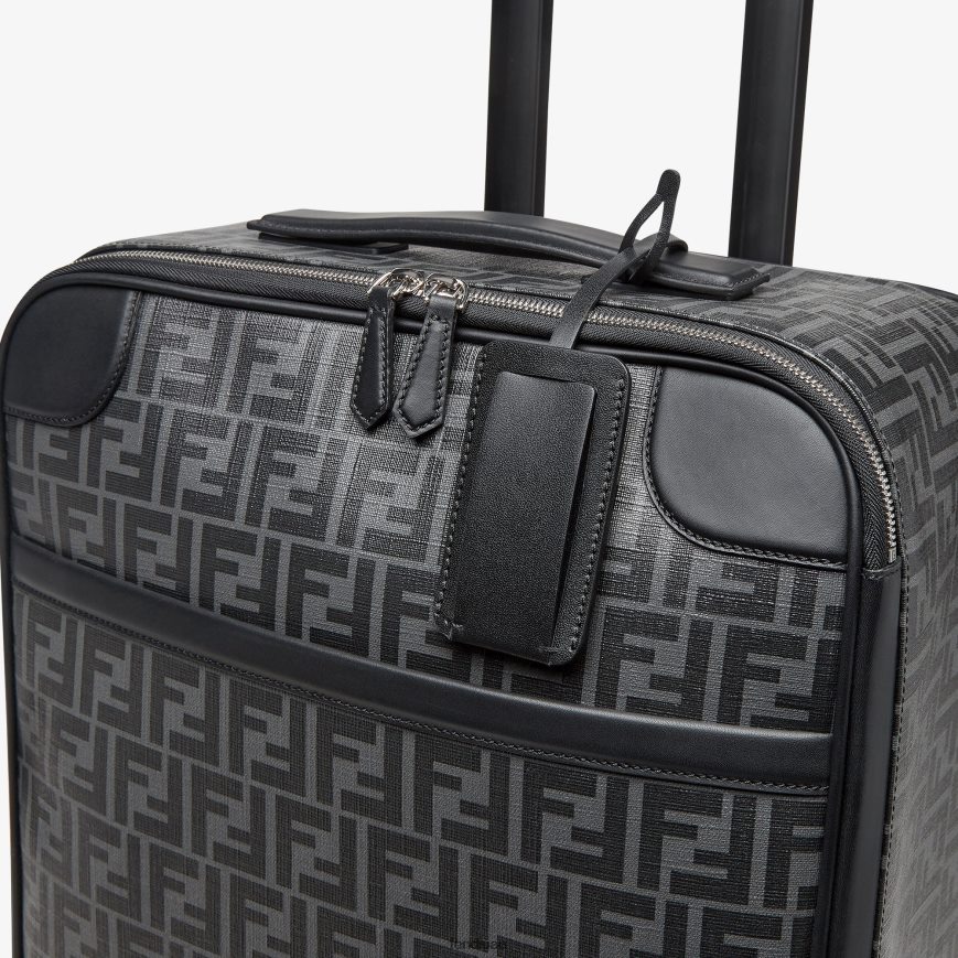 حقيبة سفر بأربع عجلات مصنوعة من القماش مع شعار ff باللون الأسود مع سحاب مزدوج المنزلق.