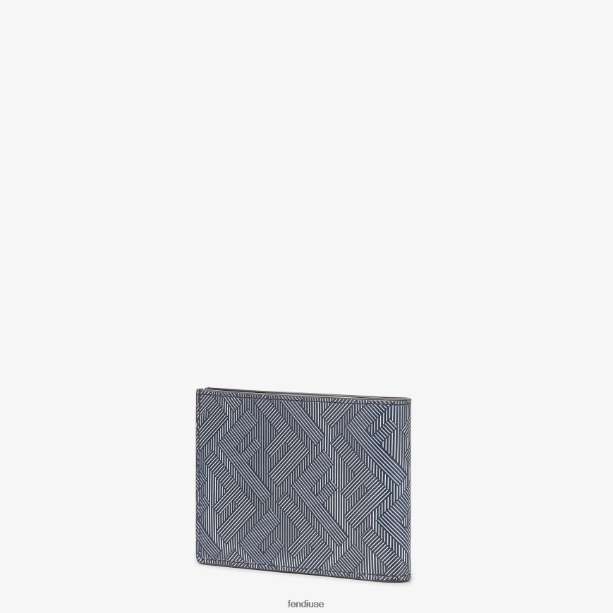 محفظة ثنائية الطي مع حجرة للفواتير وأربع فتحات للبطاقات وجيب واحد مطلي للمستندات بملمس شفاف. مصنوع من جلد فندي المظلل باللونين الرمادي الفاتح والأزرق، مع شعار ff مخطط. بطانة جلدية بيضاء وزرقاء. حروف فندي روما وأدوات معدنية مطلية بالبلاديوم.