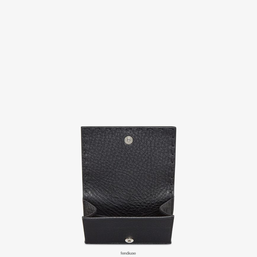 محفظة بقسمين داخليين للفواتير وجيب خارجي مزود بقفل سريع. مصنوع من جلد Cuoio Romano باللون الأسود. مزينة بحروف فندي روما وحواف منتهية بخياطة سيليريا المخيطة يدويًا. أدوات معدنية مطلية بالبلاديوم.