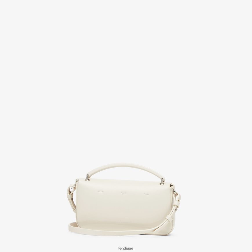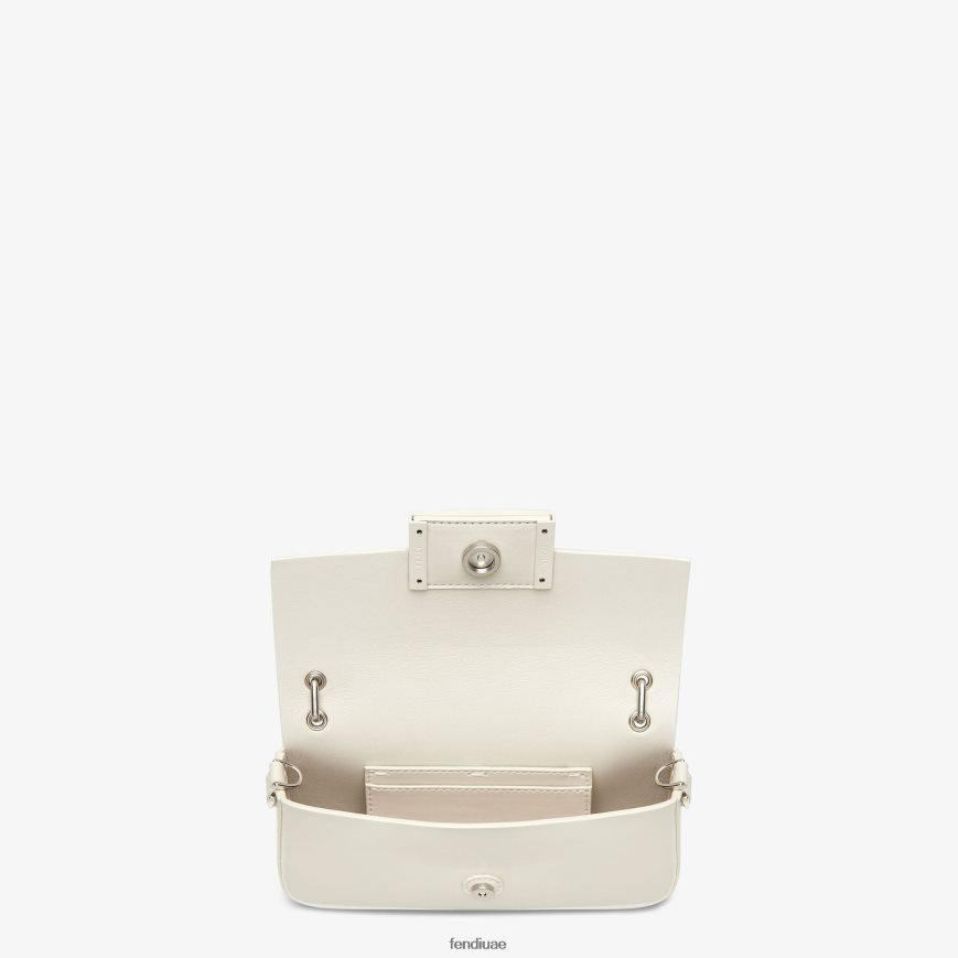 حقيبة هاتف باجيت للهاتف الذكي مع غطاء أمامي وزر مغناطيسي للإغلاق. مقبض صلب صغير وحزام كتف قابل للفصل. مصنوع من الجلد الأبيض اللامع مع تأثير لامع دقيق. تصميم ff مطلي بالمينا بلون واحد. أدوات معدنية مطلية بالبلاديوم.