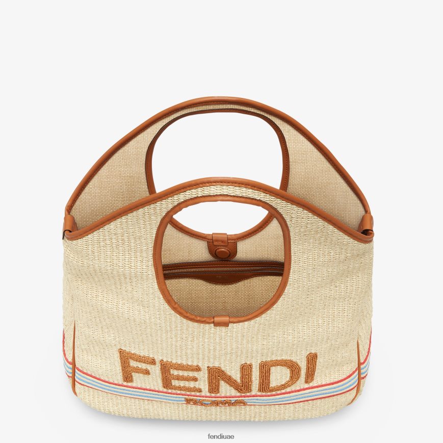 حقيبة تسوق مصنوعة من القش ذو اللون الطبيعي في نسيج بتأثير الطحلب، مع تطريز الرافية فندي روما وخطوط أفقية متباينة بلونين.