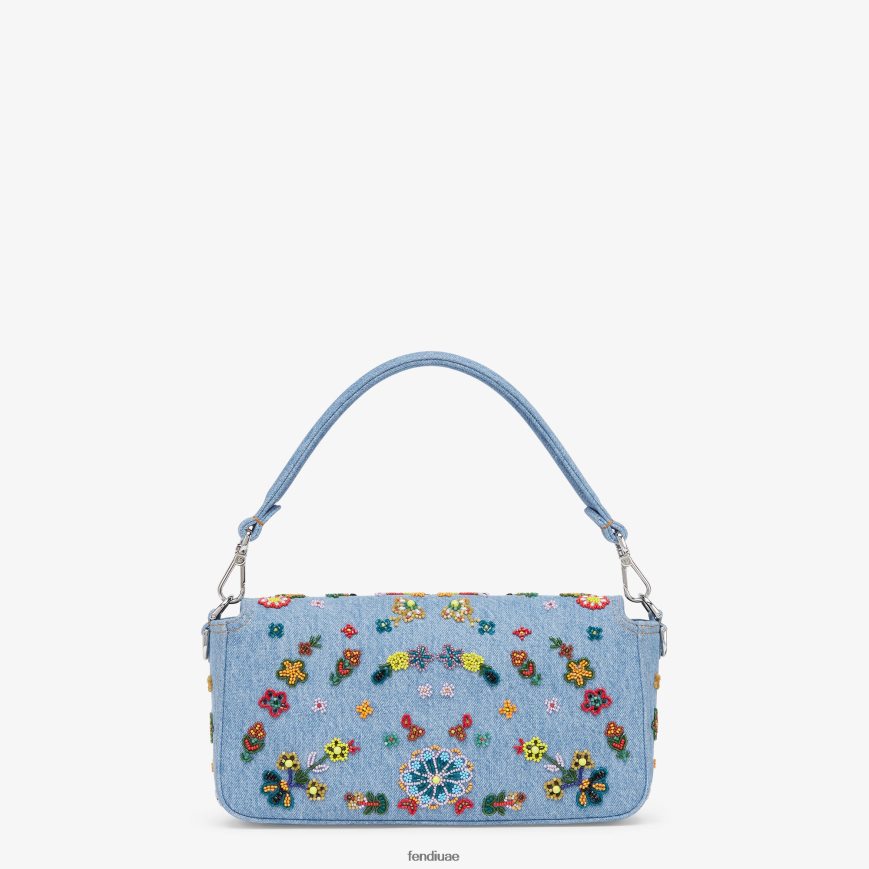 حقيبة باغيت متوسطة الحجم ومبدعة: إعادة إصدار لأسلوب أرشيفي، مستوحاة من تطريز الزهرة على قماش الدنيم من موسم ربيع وصيف 2020. مصنوعة من قماش الدنيم باللون الأزرق الفاتح ومطرزة بأزهار صغيرة من الخرز متعدد الألوان ومزينة بإبزيم على شكل حرف ff.