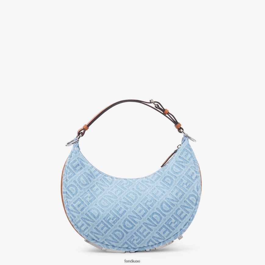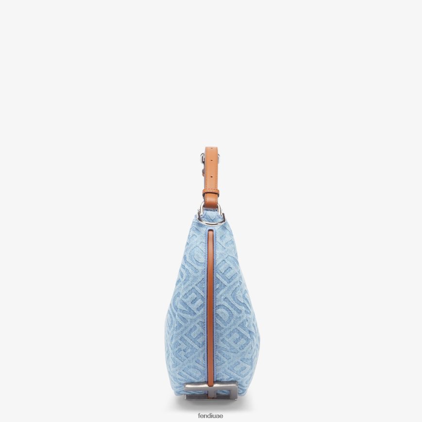 حقيبة هوبو صغيرة مصنوعة من قماش الدنيم باللون الأزرق الفاتح مع مرآة فندي على كامل التصميم وتفاصيل من الجلد باللون البني. مزينة بحروف فندي من معدن البلاديوم العتيق، ويمكن رؤيتها عند ارتداء الحقيبة تحت الذراع.