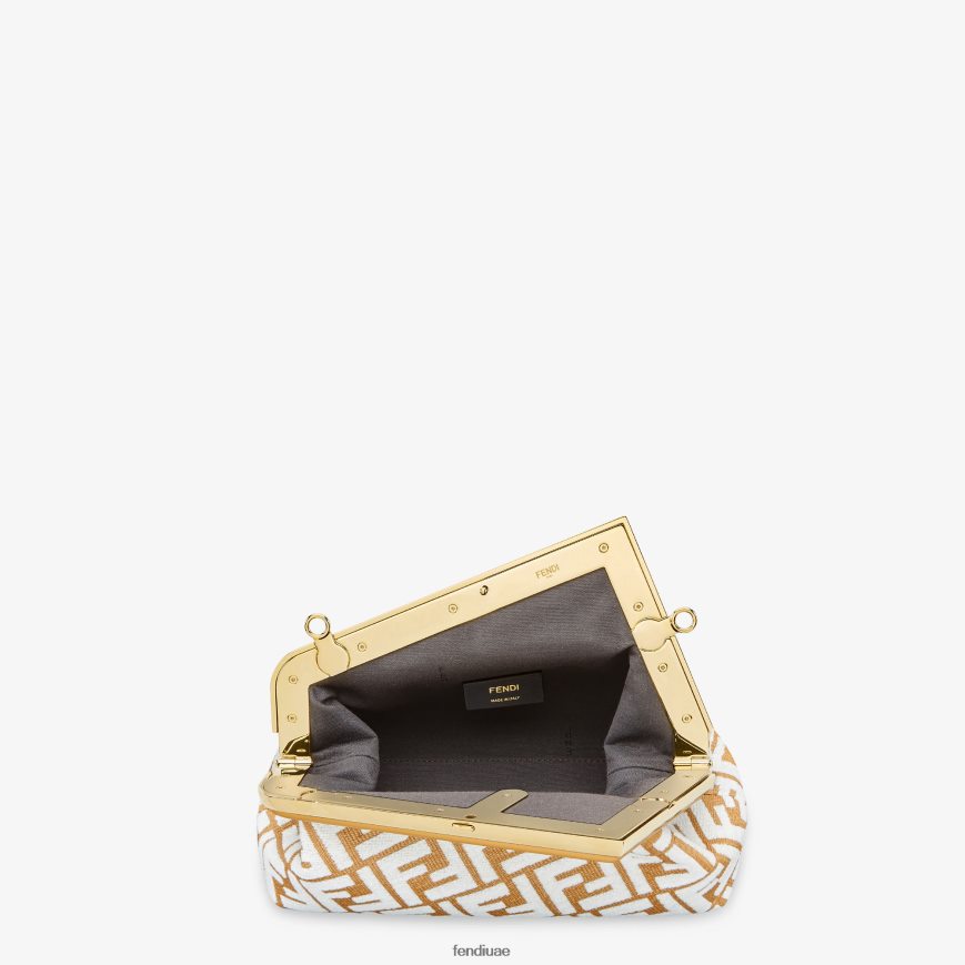 أول حقيبة صغيرة من فندي مصنوعة من الرافية ذات اللون الطبيعي مع شعار ff المطرز في قماش شانيل أبيض بتأثير نسيجي للحصول على مزيج ملمس فريد. مشبك معدني كبير الحجم على شكل حرف F مربوط بجلد نابا باللون البني الفاتح.