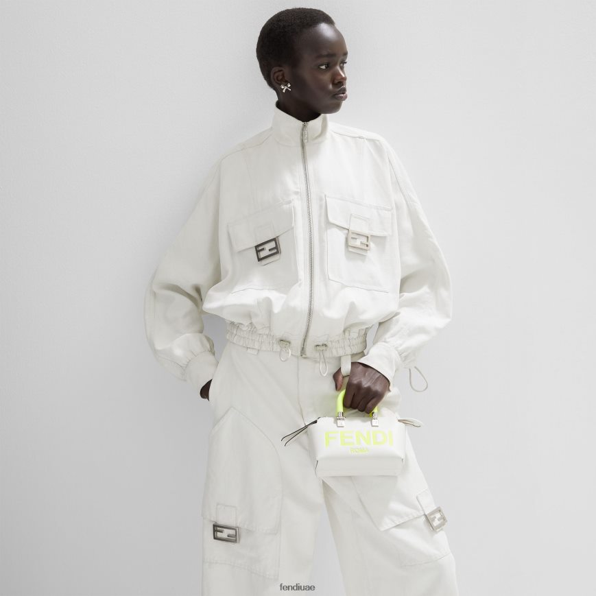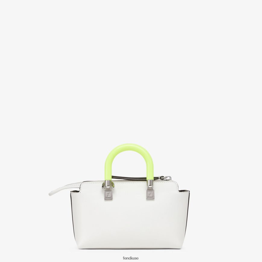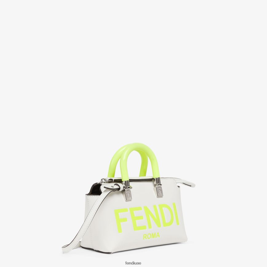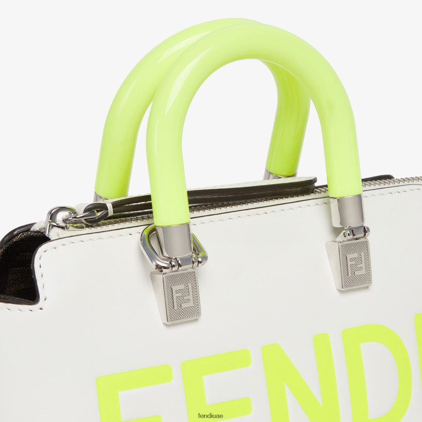 حقيبة باي ذا واي بوسطن الشهيرة مصنوعة من الجلد الأبيض مع حروف فندي روما باللون الأصفر النيون المختوم بالحرارة ومقابض زجاجية صلبة من زجاج شبكي باللون الأصفر النيون. إغلاق بسحاب.