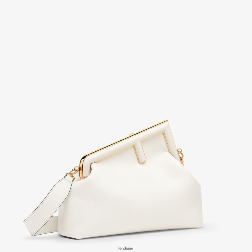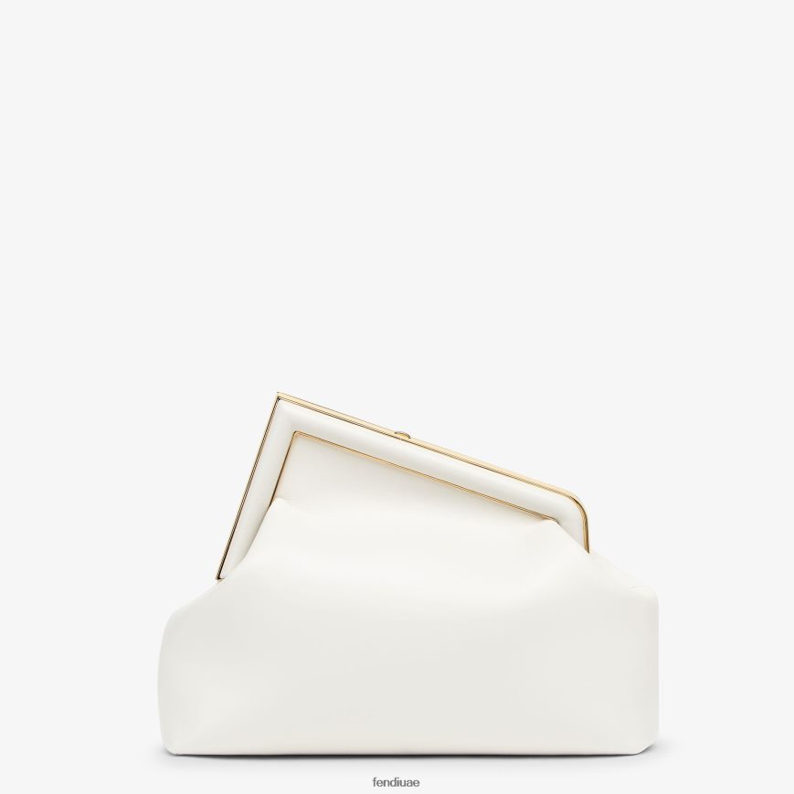حقيبة فندي الأولى متوسطة الحجم مصنوعة من جلد نابا الناعم باللون الأبيض مع مشبك معدني كبير الحجم مثبت على جلد نابا.