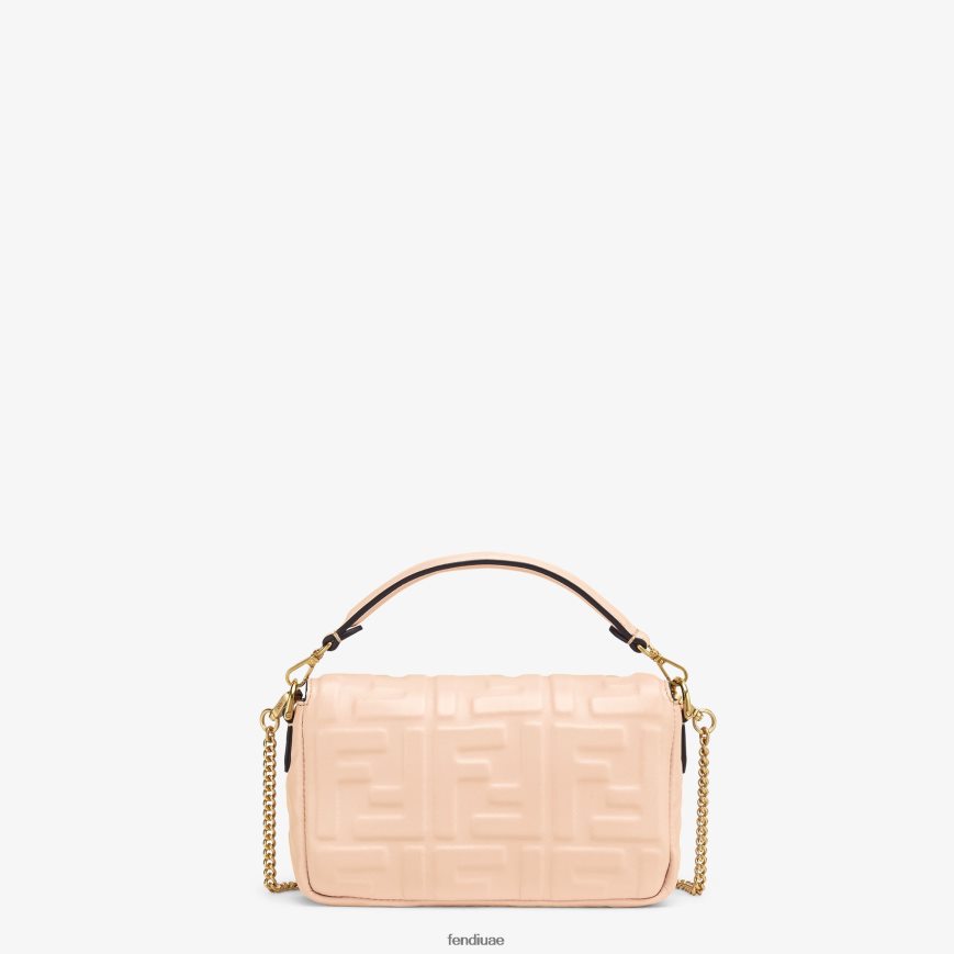 حقيبة باغيت صغيرة أيقونية مصنوعة من جلد نابا الناعم باللون الوردي الفاتح مع شعار ff منقوش ثلاثي الأبعاد. مزين بمشبك ff.