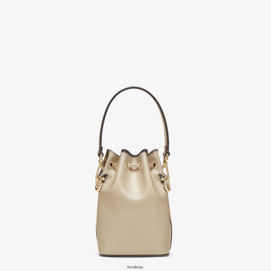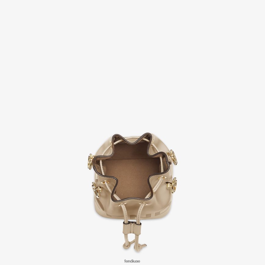 حقيبة دلو مون تريزور صغيرة مصنوعة من الجلد باللون الرمادي الحمامة مع طبعة حروف فندي روما.