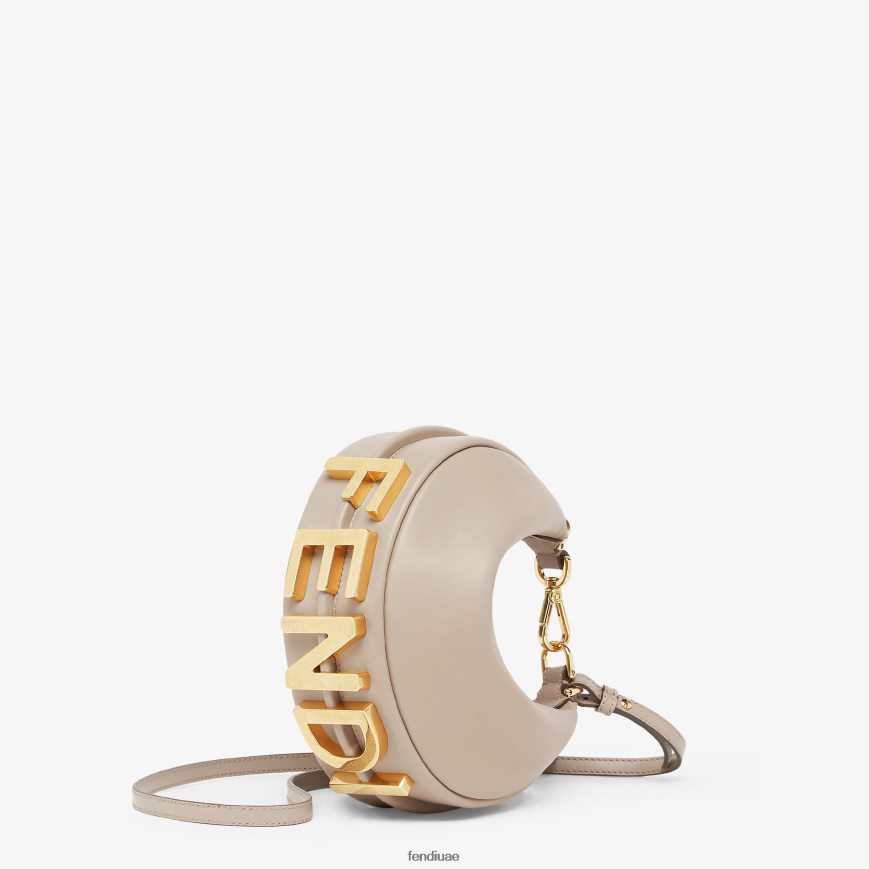 حقيبة هوبو صغيرة مصنوعة من جلد ناعم بلون رمادي فاتح، ومزينة بحروف فندي معدنية ذهبية عتيقة.