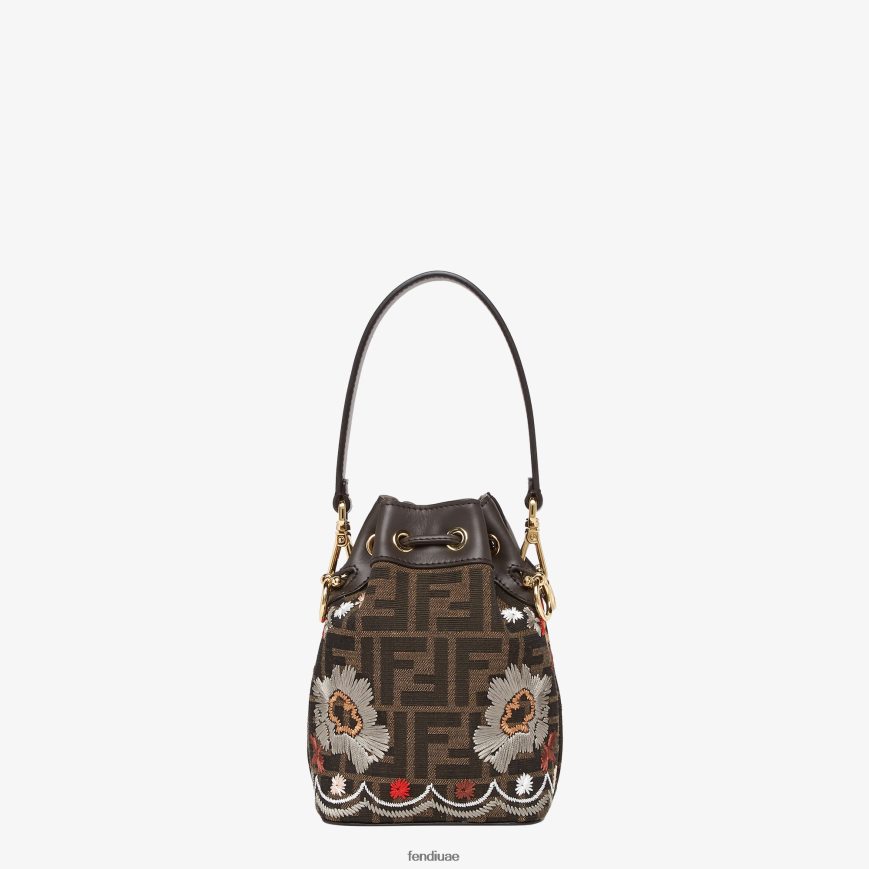 حقيبة دلو مون تريزور صغيرة مصنوعة من قماش الجاكار بشعار FF، ومطرزة بدقة مع زخارف نباتية في خيوط متعددة الألوان.