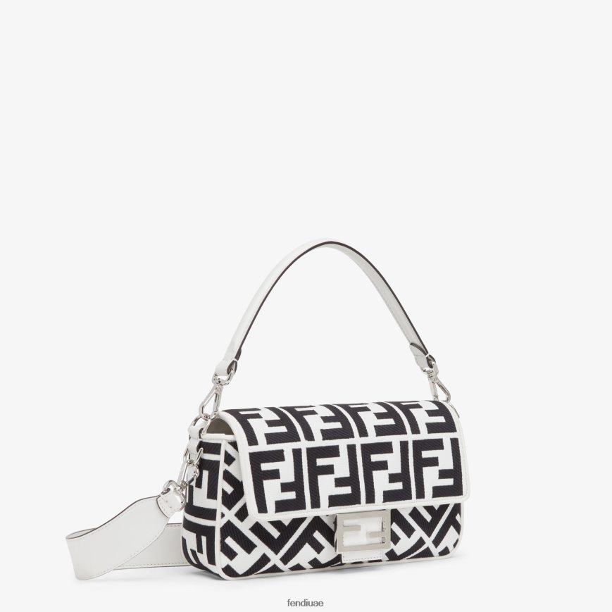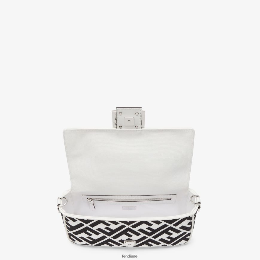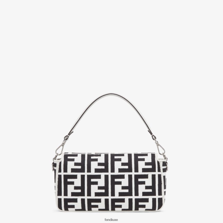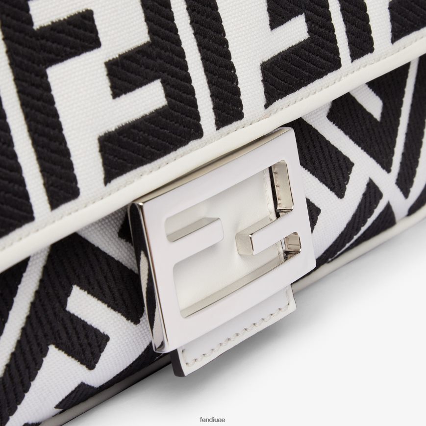حقيبة باغيت متوسطة الحجم أيقونية مصنوعة من القماش الأبيض مع شعار ff باللون الأسود في تطريز بارز ومشبك ff مزخرف.
